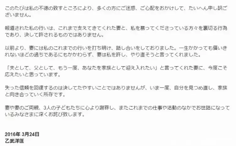 2016年,媒体曝出乙武婚内出轨的消息,起初,乙武还和他的妻子狡辩,后来随着越来越多的证据出现,乙武洋匡承受不住压力,才被迫公开承认了这个事情。